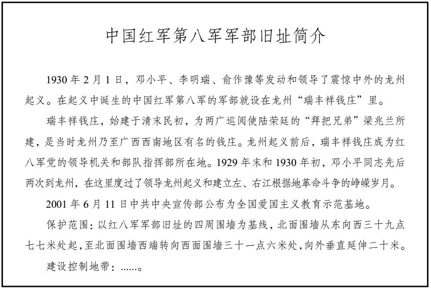 第十三条 保护标志牌(见附件)正面从上至下应当依次标示自治区级红色资源、红色资源名称、公布机关与公布日期、树立标志机关与树立日期、红色资源编号;背面应书写经红色资源管理部门审核后的红色资源简介,正面、背面均采用仿宋字体。