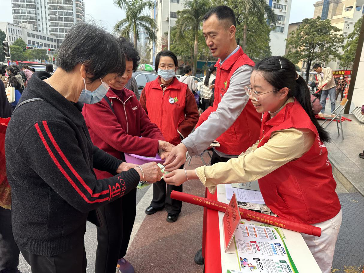 图为动漫 志愿者为社区群众发放垃圾分类宣传手册