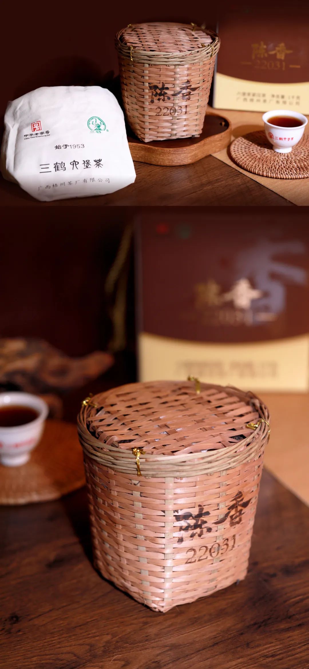 【陈香22031】是三鹤经典陈香系列产品的新作,精选细嫩特级茶,经汽蒸后压入手工编织竹箩内,经过三年时间,茶叶在梧州茶厂得天独厚的环境下,在四季温湿度调节下,得以优良转化,品质得以升华。