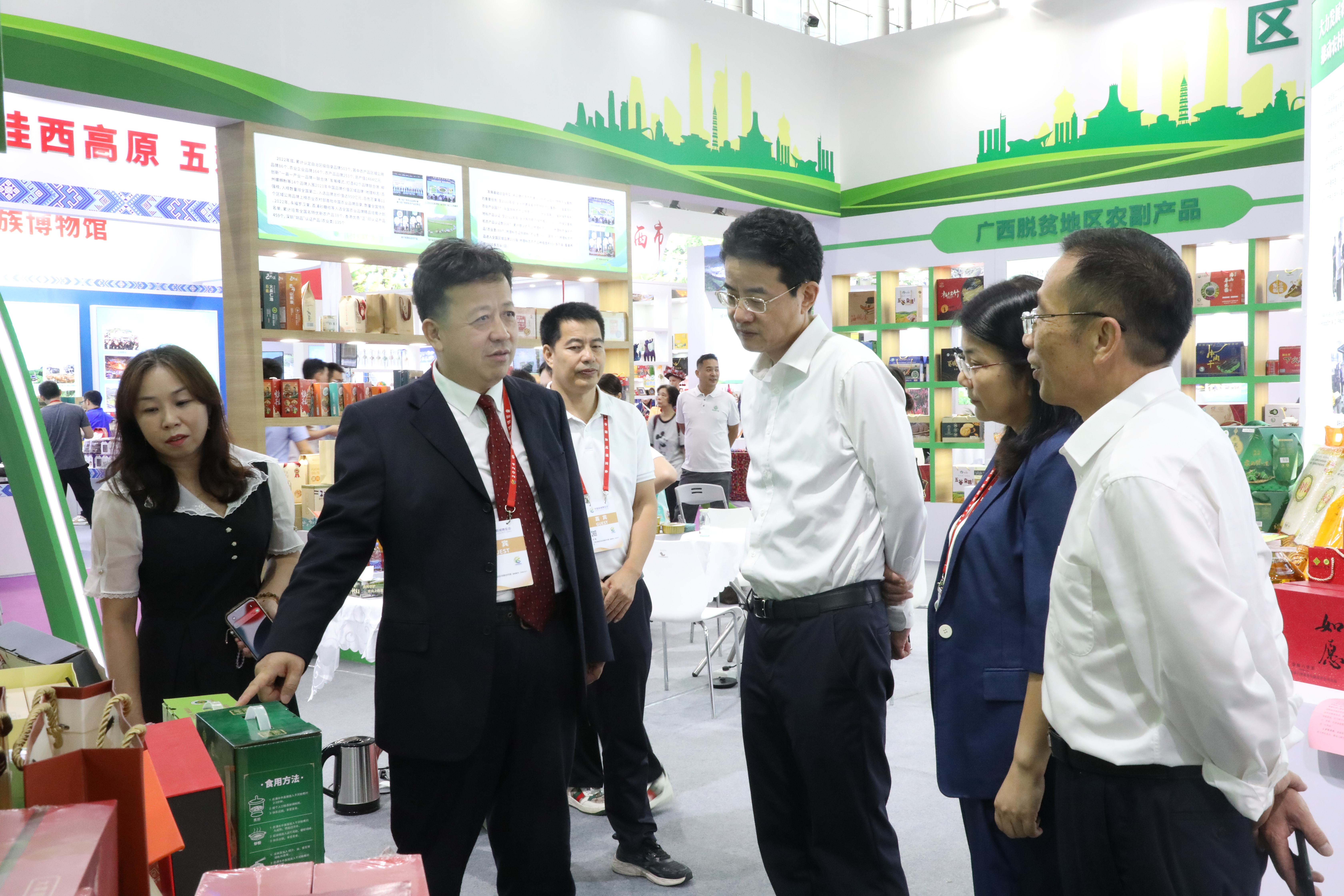 推介会后,陈开枝、范洪亮等领导和与会嘉宾共同巡馆,察看广西名特优农产品展示与推介情况,与各设区市及展出单位、企业有关负责人亲切交谈,详细了解各单位、企业与粤港澳大湾区相关单位、企业对接情况并慰问参展人员。