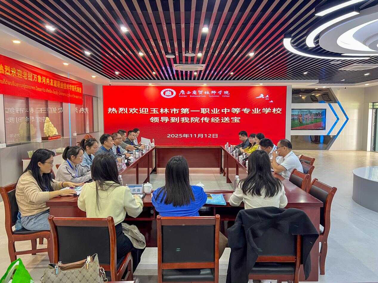 为深化校际合作,共享办学经验,共同提升教育教学质量,11月12日上午,玉林市第一职业中等专业学校副校长黄善升率招生就业办骨干及优秀班主任代表一行12人,到访广西商贸技师学院明阳校区进行交流座谈。学院党委委员、副院长李洁琛及学生科、招生就业科相关负责人热情接待了来访嘉宾,双方围绕班主任队伍建设、实习学生管理等核心议题进行了深入探讨。